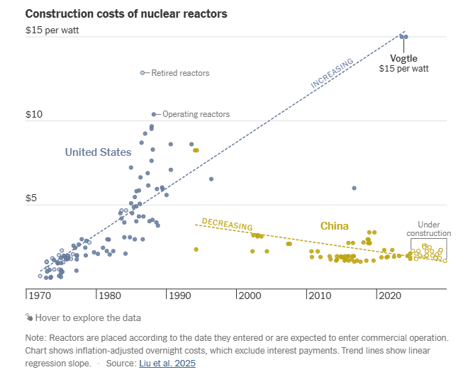 Additionally, the Times reports China’s nuclear companies build only a handful of reactor types, and they do it repeatedly to establish economies of scale, streamlining the regulatory process and simplifying the supply chain. The results have been impressive.
