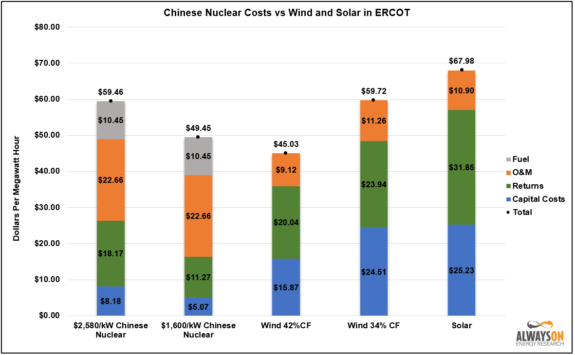 The graph below shows the cost of Chinese nuclear power at various capital costs compared to new wind and solar in Texas, where Chinese nuclear produces power between $50 and $60 per megawatt hour (MWh), which is lower than solar ($68/MWh) and lower cost than wind ($60/MWh) if we assume the state-wide capacity factor of 34 percent.