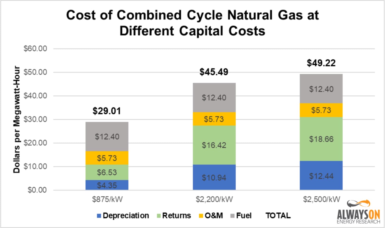 The U.S. EIA Short-Term Energy Outlook estimates natural gas prices will average $4 per MMBtu in 2025, and jump to $4.90 per MMBtu in 2026, up from $2.20 per MMBtu in 2024. The graph below shows the cost of electricity generated at CC natural gas plants at the various fuel prices discussed in this paragraph.