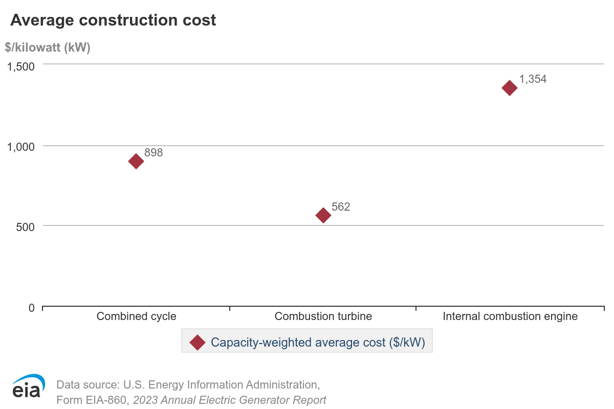 Combustion turbine (CT) natural gas plants, also known as simple-cycle plants, are also experiencing rising costs. According to EIA data, the average cost of a CT gas plant placed into service in 2023 was $562,000 per MW of installed capacity.