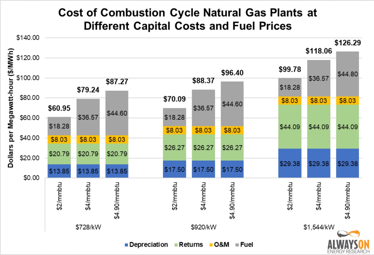 As we show in the graph, a near tripling of capital costs does not result in a tripling of the LCOEs of the gas plants. The LCOE of the high-end capital cost of $2,500 per kW is $49.22 per MWh, which is a 70 percent increase compared to the low-end estimates of $29.01 for plants that cost $875 per kW.
