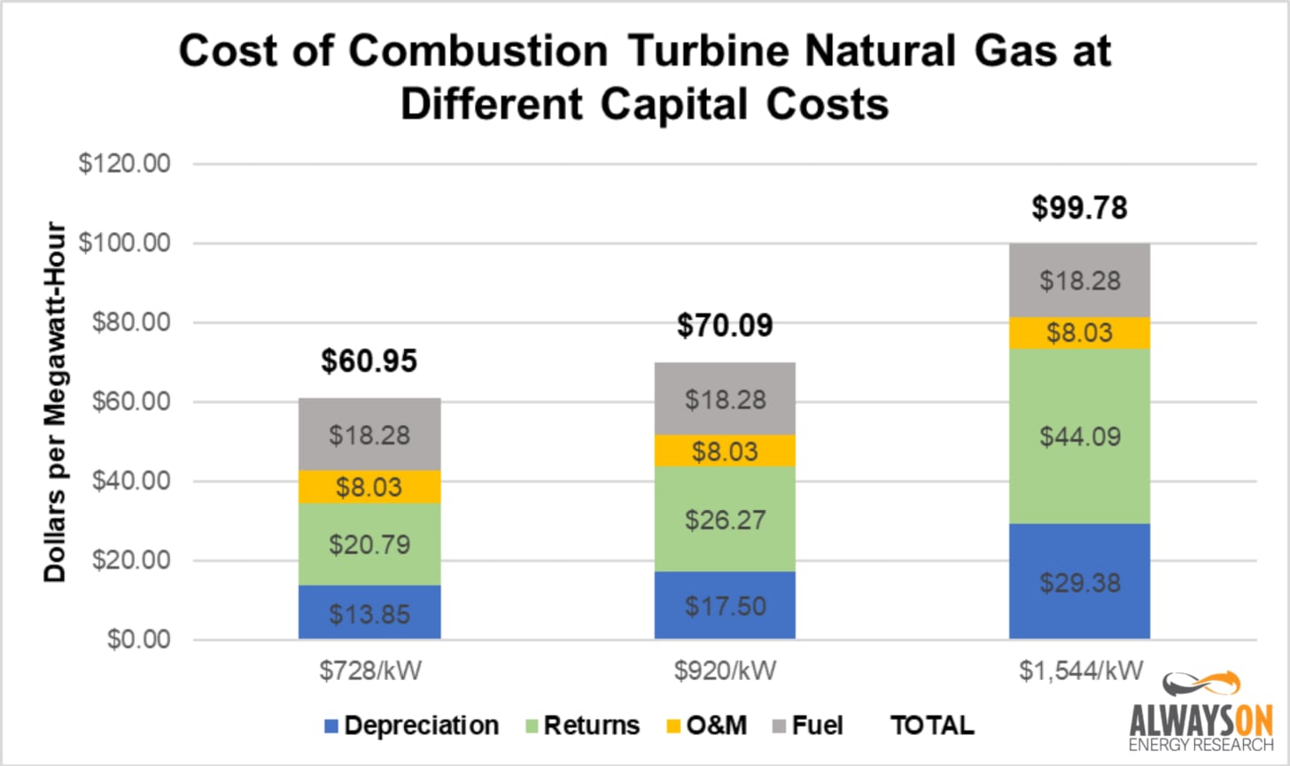 A recent study by Grid Lab and conversations with our friends in the utility business suggest that CT gas plants placed into service in 2025 will have capital costs ranging from $728 per MW of capacity to $1,544, a stunning increase in prices in just the last two years.