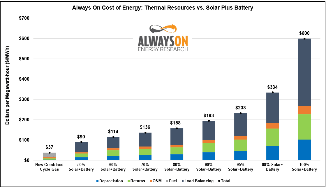 Compared to the figures shown in “The Baseload Solar Beatdown,” the 50 percent solar plus battery storage levels are 15 percent higher, using higher capital cost and fuel prices for the natural gas backup generation. Additionally, we presented the cost of combined cycle natural gas at the highest capital cost and fuel price from above.